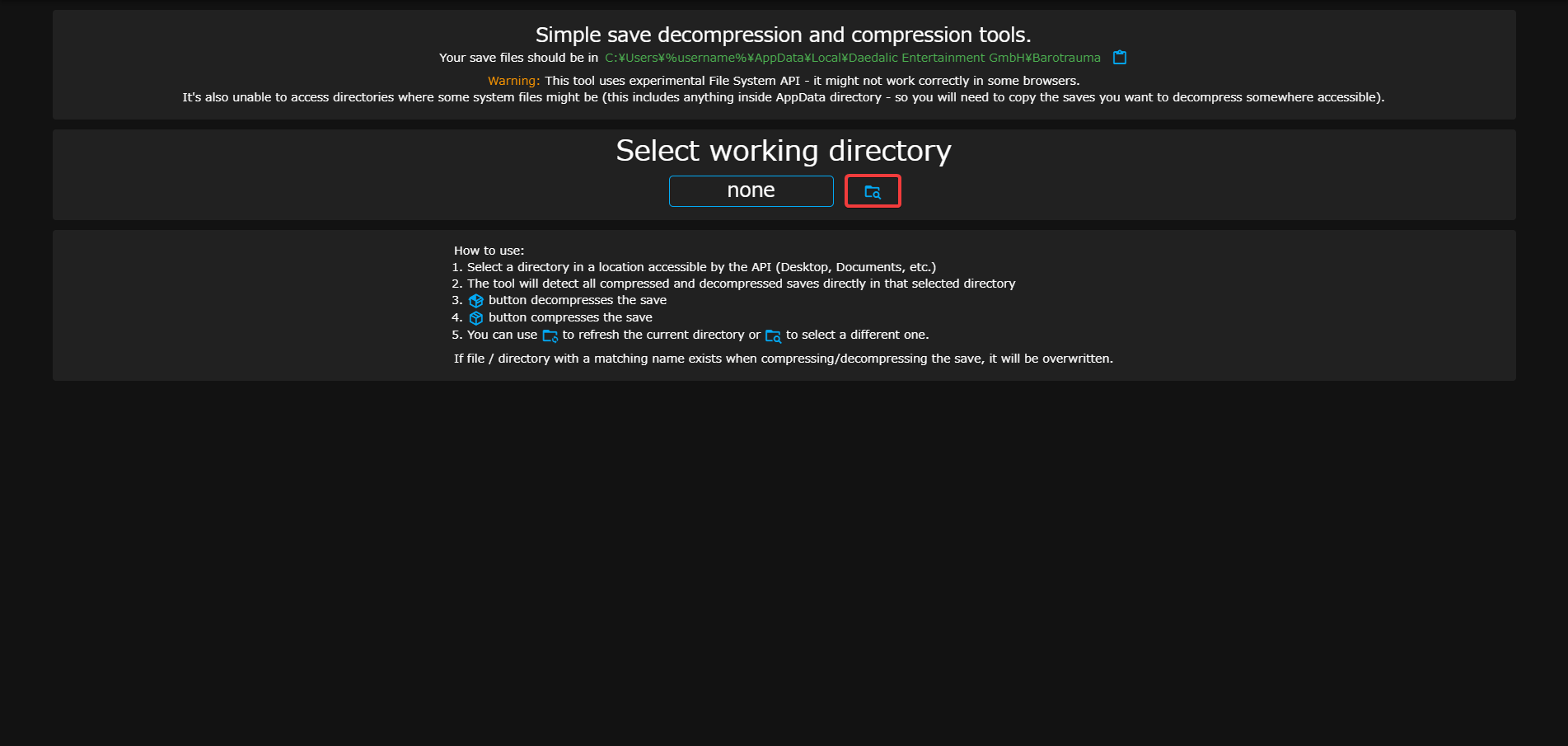 セーブして閉じ、ブラウザで開いたセーブファイルのエディタに戻って、編集しているセーブファイルの名前の横にある、右のcompressボタンを押してください。 新しく更新された.saveファイルをC:\Users\<ユーザー名>\AppData\Local\Daedalic Entertainment GmbH\Barotraumaにある同じ名前のファイルを上書きし、ゲームを起動して確認してみましょう。