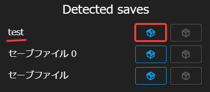 ここで、編集したいセーブの名前の横にあるボタンのうち、画像で示されているように左のdecompressボタンを押してください。 例えば、testというセーブファイルをdecompressすると、testフォルダーが同じディレクトリに作られます。
